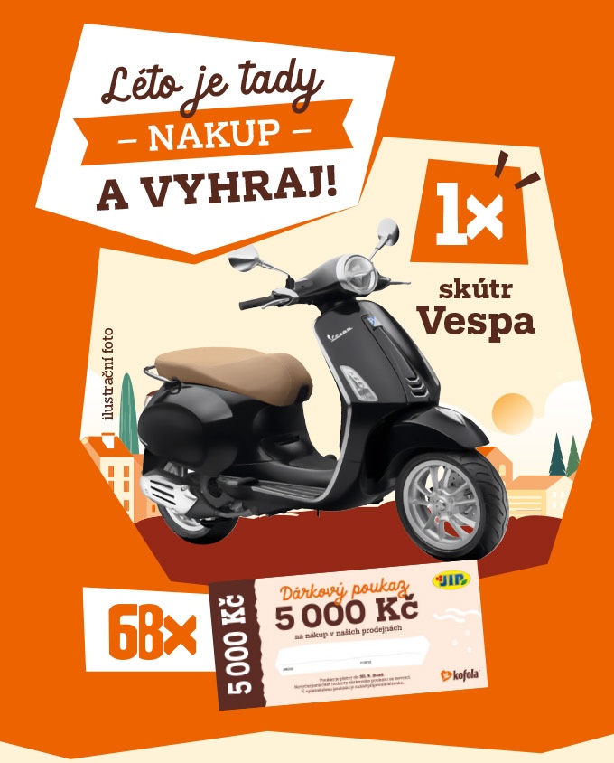 Soutěž probíhá od 1. 5. 2026 00:00:00 hod. do 31. 8. 2026 23:59:59 hod. a je rozdělena na 12 soutěžních kol. V každém kole losujeme čtyři výherce poukázek na nákup v JIP. Výherce poukazu na skútr Vespa losujeme po skončení soutěže.